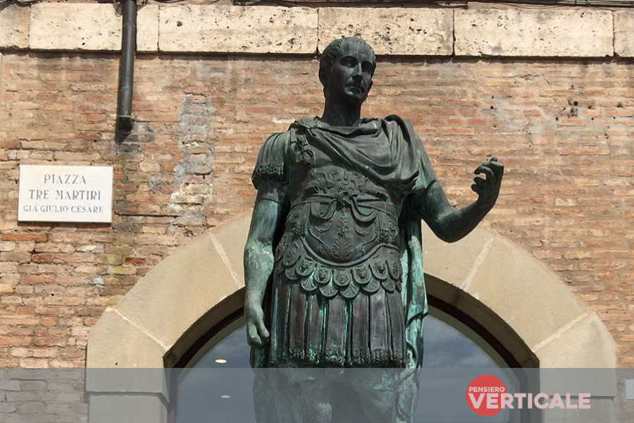 È proprio dalla figura storica di Giulio Cesare o, meglio, della travagliata storia della sua statua, che la località romagnola balza all’ “onore” della cronaca. Nel 1933, Benito Mussolini, dona alla città di Rimini la copia – l’originale è conservata a Roma in Campidoglio -, dal peso di ben dieci quintali, della statua di Giulio Cesare realizzata dalla Fonderia Laganà. La statua fu quindi posizionata ai piedi della Torre dell’Orologio, in quella che allora era piazza Giulio Cesare, poi rinominata piazza Tre Martiri nel 1944. A giugno 1945 la statua fu rimossa e trasportata, salvandola dagli imprevedibili moti dello scontro civile postbellico, dai Vigili del fuoco in un capannone e conseguentemente interrata lungo il fiume Marecchia. Solo otto anni dopo, nel 1953, la statua fu ritrovata e riesumata per essere concessa, in via liberatoria, alla Caserma “Giulio Cesare” del Reggimento d’Artiglieria di Rimini dov’è rimasta fino al 2019 a causa dello smantellamento dell’edificio militare e della futura realizzazione del complesso “cittadella della sicurezza”. Per ben venticinque anni, dal 1960 al 1985, il commendatore Umberto Bartolani si spese costantemente per il ritorno della statua entro le Mura urbane della città. Nel 1996, a seguito di rilevanti pressioni di cittadini e associazioni, l’amministrazione del tempo, per opera del sindaco Luciano Chicchi, deliberò la collocazione di una nuova riproduzione della statua realizzata grazie al Rotary club di Rimini in collaborazione della Cassa Rurale di San Gaudenzio.